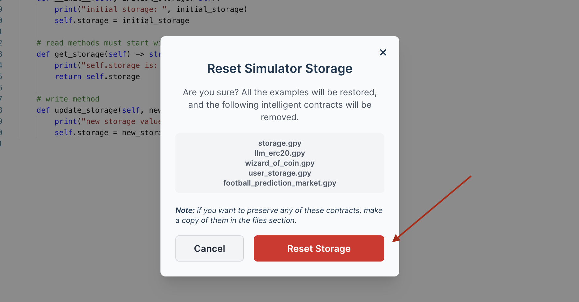 1. Click "Reset Storage": this option allows you to clear all the current data stored in the studio, including the state of deployed contracts, transaction history, and any cached information.